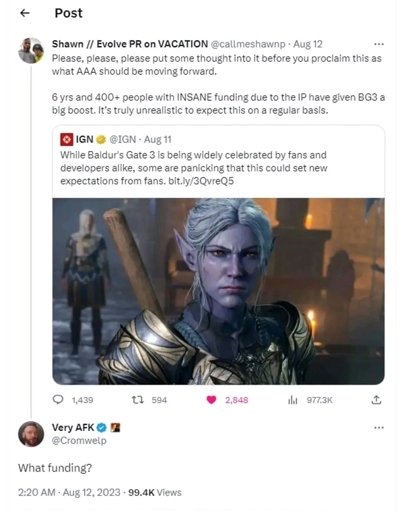 Uhh… today’s AAA studios have THOUSANDS of employees, hundreds of millions of dollars in budgets, and huge IPs on which to draw. Elder Scrolls, Fallout, Assassin’s Creed, Diablo, Warcraft, Mass Effect, Dragon Age… these studios have VASTLY larger resources than Larian. Like, an order of magnitude larger. This is gaslighting and whining. I’m not having it. Do better, AAA devs. Do a lot better.