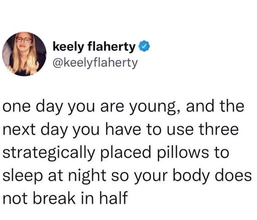 FWIW - I’m in my mid-50s and still feel basically the same as I did in my late 20s / early-30s. All of these aging memes strike me as odd and/or maybe people who haven’t been kind to their bodies. I sleep like a rock on a normal bed, with one pillow, and wake up rested with no pain and get out of bed and do normal stuff just fine. Weird, huh?