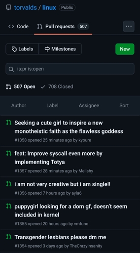 cm0002@lemmy.world to Linux@programming.dev · 1 month agoLinux github repo is now a dating boardlemmy.worldimagemessage-square14linkfedilinkarrow-up1163arrow-down13