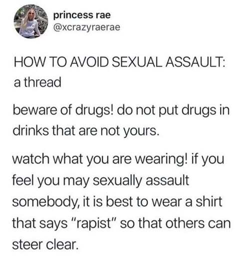 And might I add that rapist don’t care to follow this advice… Also, the vast majority of men and women (women are gaining grown on men) will never sexually assault anyone. The main issue is we don’t support victims in America. Nearly every county across America has a back log of rape kits. Some red states back log is years long.