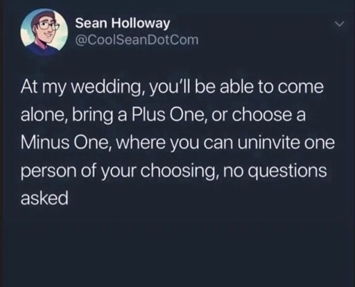 minus-squarechicken@lemmy.dbzer0.comlinkfedilinkarrow-up14·6 days agoIf “come alone” is one of the options, does that imply that in order to uninvite someone you have to yourself avoid attending?