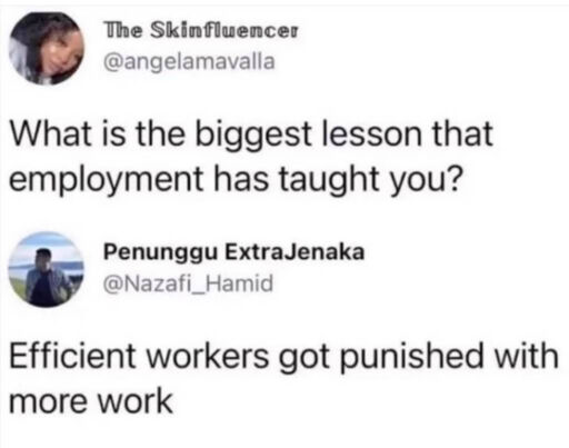 🇵🇸 Free Palestine 🇵🇸@lemmy.ml to Asklemmy@lemmy.ml · 2 years agoWhat is the biggest lesson that employment has taught you?lemmy.mlimagemessage-square3linkfedilinkarrow-up113arrow-down10