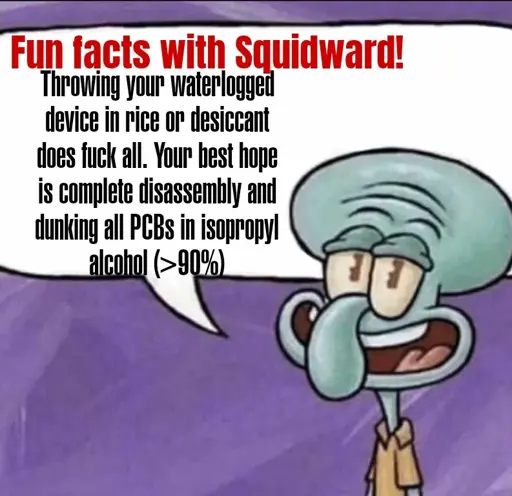 Would using isopropyl alcohol be better option? Sure it is. but telling my aunt to do it, and device will probably die because she doesn’t know how to handle pcbs anyway. I’d much rather just advice using dessicant and hope mineral residue doesn’t sort anything. And I’ll continue with that advice forever.