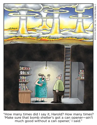 “How many times did I say it, Harold? How many times? ‘Make sure that bomb shelter’s got a can opener—ain’t much good without a can opener,’ I said.”