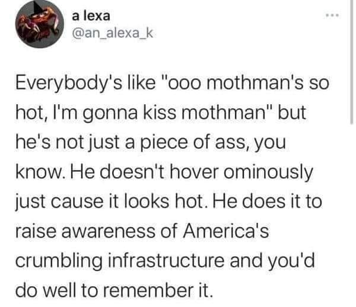 Flying Squid@lemmy.world to Microblog Memes@lemmy.worldEnglish · 1 year agoMothman deserves your respect.lemmy.worldimagemessage-square4linkfedilinkarrow-up13arrow-down10