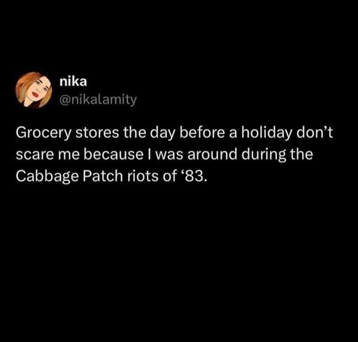 minus-squareXella@lemmy.worldlinkfedilinkarrow-up8·5 days agoI like to go grocery shopping at Walmart on Black Friday. I’m not fazed. I was there in the trenches with my aunt for Tickle me Elmo and Beanie Babies. I was born and bred for this.
