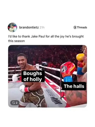 Lady Butterfly she/her@reddthat.com to memes@lemmy.world · 3 days agoAnthony Joshua is my fucking heroreddthat.comimagemessage-square50linkfedilinkarrow-up1599arrow-down119