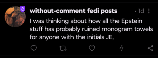 minus-squareagingelderly@lemmy.worldlinkfedilinkEnglisharrow-up19·19 days agoWho the hell can afford monogrammed towels that isn’t on the Epstein list?
