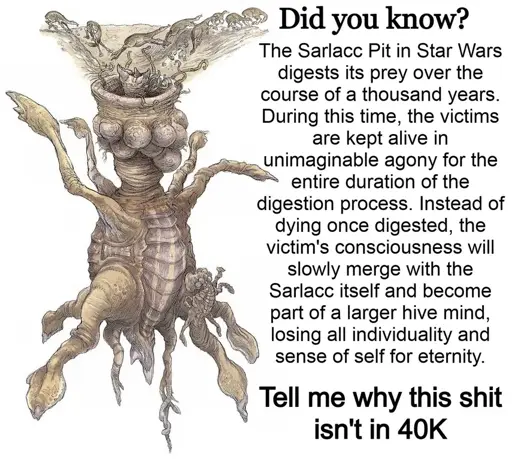 I always figured that “digested over a thousand years” was a bit of a misnomer. I’m inclined to think that the almighty sarlacc incorporates its victims into its own biology, and uses them up over a thousand years. Like, you spend a thousand years as an unwilling gall bladder in the depths of the sarlacc, until the process very slowly eventually kills you.