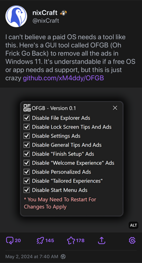 I can’t believe a paid OS needs a tool like this. Here’s a GUI tool called OFGB (Oh Frick Go Back) to remove all the ads in Windows 11. It’s understandable if a free OS or app needs ad support, but this is just crazy github.com/xM4ddy/OFGB
