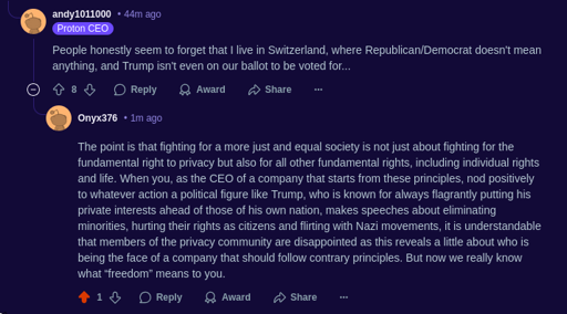 Onyx376@lemmy.ml to Privacy@lemmy.ml · edit-210 months agoFlirting with Trump is flirting with Nazism - Response to Andy Yen (CEO of Proton AG) on Reddit 📢📢📢plus-squarelemmy.mlimagemessage-square3linkfedilinkarrow-up10arrow-down10